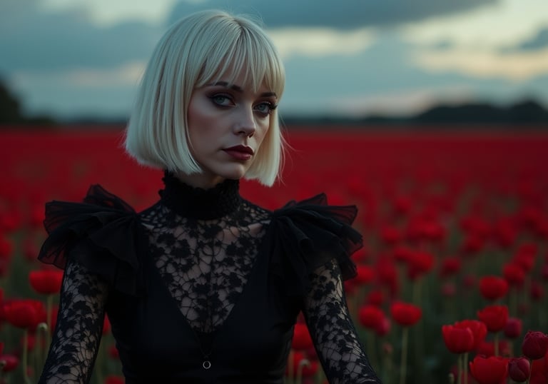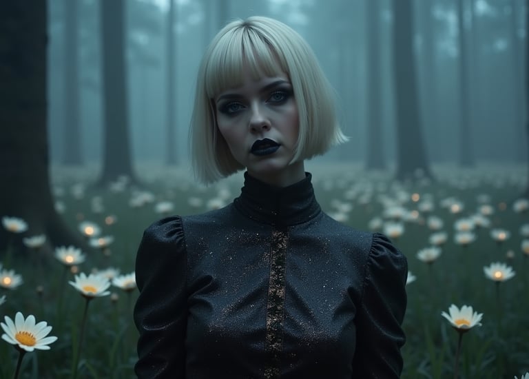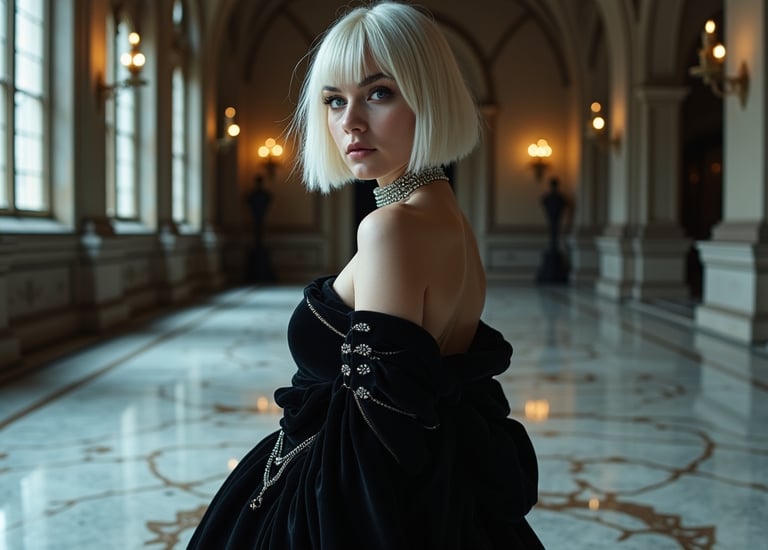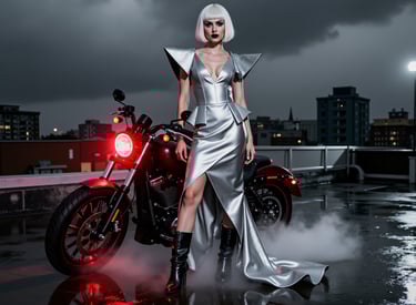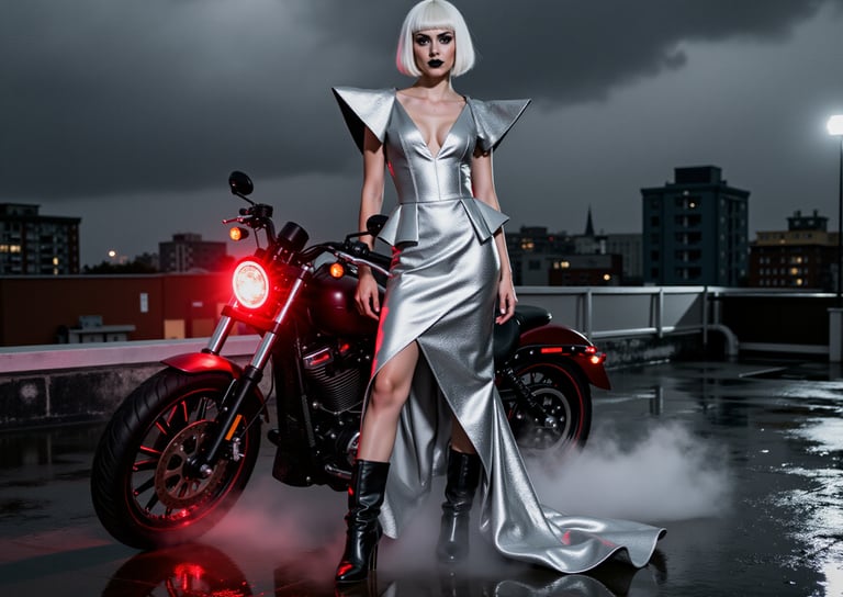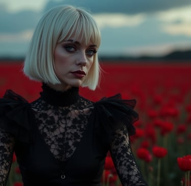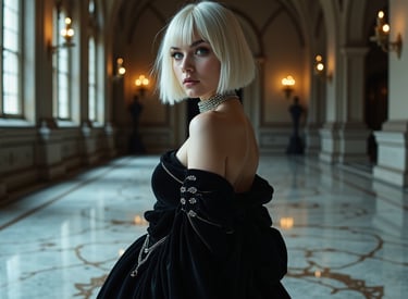 Nova is Noir Starr’s avant-garde heartbeat, where gothic sensuality collides with high fashion precision. With her platinum-blonde bob, stormy grey eyes, and unapologetically bold makeup, she embodies a new era of digital couture — fearless, cinematic, and raw.